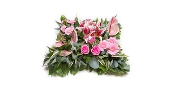 A contemporary sectioned cushion tribute in shades of pink with varigated foliage.