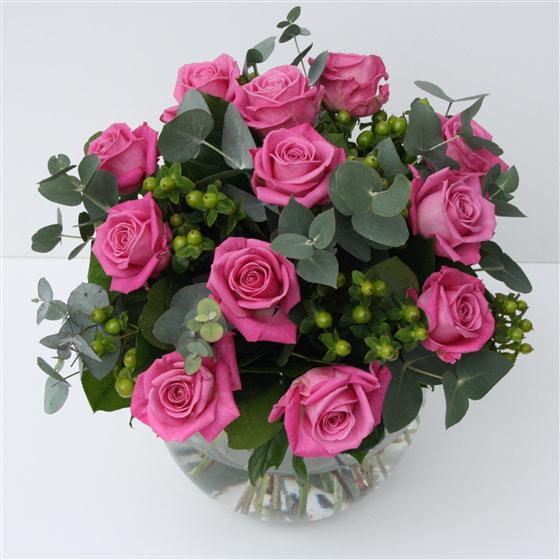 A dozen long stemmed pretty pink roses combined with mixed foliage and hypericum berries.