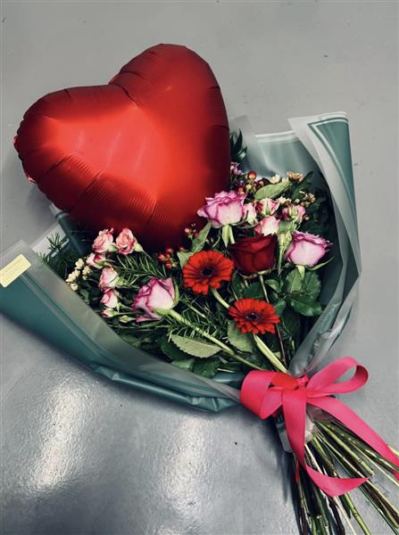 A Helium Balloon incorporated into a Hand Tied bouquet of assorted flowers including Roses, Gerberas and foliage